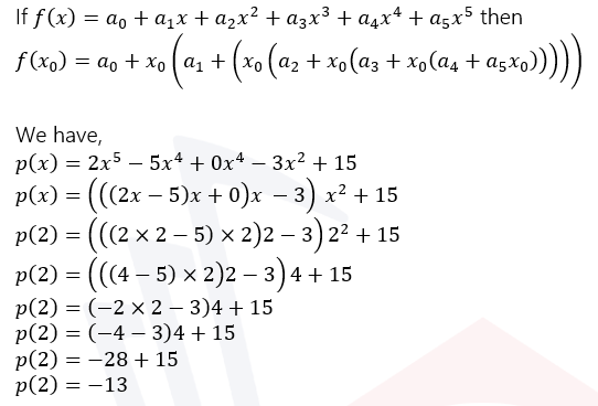 Q1. c) Using Horner’s rule, evaluate the polynomial p(x)=2x^5-5x^4-3x^2+15 at x=2. Analyse, the computation time required for polynomial evaluation using Horner’s rule against the Brute force method.
